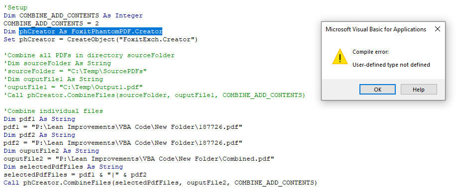 I am currently working on a macro that will take an assembly drawing, print a pdf of it and pdf's of all the drawings for the parts within its BOM, and combine those PDF's into one pdf. I have successfully completed everything up to combining the pdf files into one file. I haven't had much experience trying to open and operate other programs within the inventor VBA environment and haven't had much luck in my google searches either. I have found a reference manual for using VBA code with Foxit Phantom, but the example codes have not worked for me (reference manual attached). My code is shown below and everything is fine until after the comment "Combine the files". Any help is appreciated with defining the variables properly and calling the program to combine the files. Thanks!