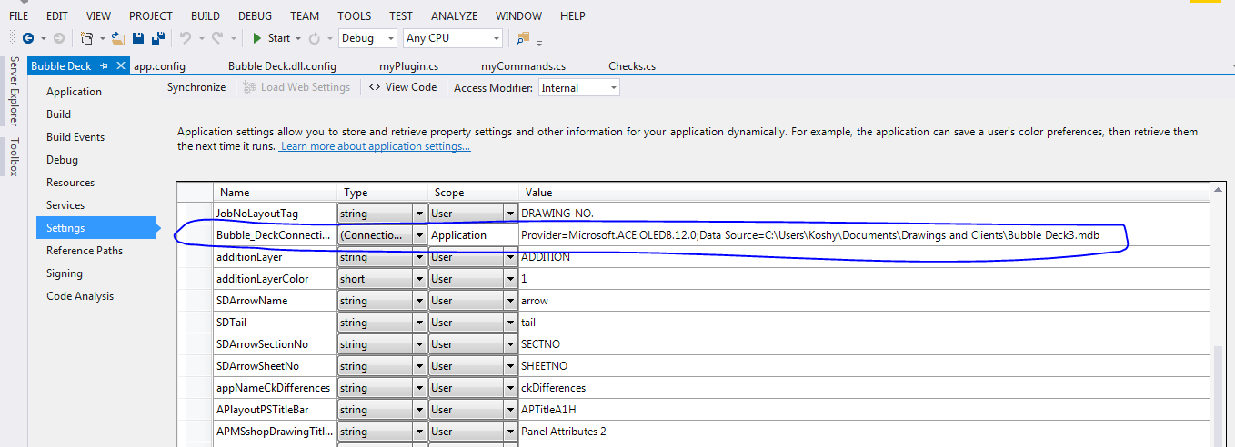 I have created an autocad .net dll. it compiles and runs fine on my computer. I am also connecting to a database. So I am using Visual Studio to store a connection string to that databse. This connection string basically tells whoever's asking, where my Database is. I have stored this connection string using Visual Studio. Basically, in Visual Studio: you click on: Project --> Project_name Properties ---> And you have all the application/user settings. I've just added a connection string there.