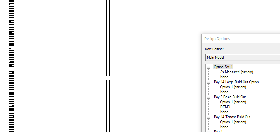 I utilize design options to separate each bay in large industrial buildings. I have the main building drawn in the primary option, then I have a design set for options which I design, and then I add another for actual confirmed tenant build outs - seems to generally work, aside from the fact that when walls intersect, even if the walls are on another design option that isn't turned on in my view, the wall on the design option that is turned on gets a little cut through it. To now I've been literally drawing in lines to fill in the spots thinking this must just be the way it is. Today I thought I'd ask to see if it is in fact the way she blows or if I'm doing something wrong? The wall with the piece missing, that is shown in my image, is on the "Bay 14 Tenant Build Out" design option, and the wall that is doing the cutting is on the "Bay 14 Large Build Out" option (that is turned off in my visibility/graphics), neither of these walls exist on any other option set, and I've not used any other Revit fanciness that I can think of.